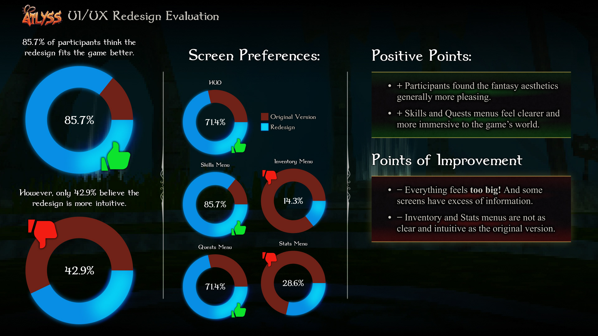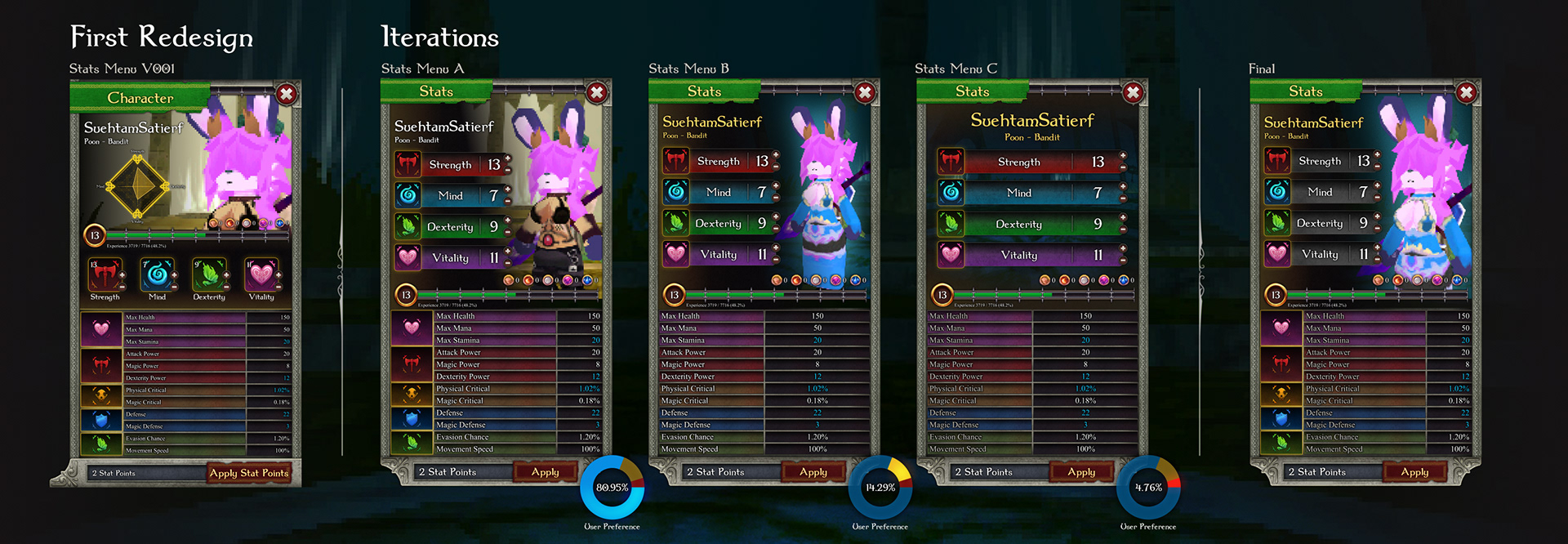 Redesign process of the character stats menu based on user feedback.