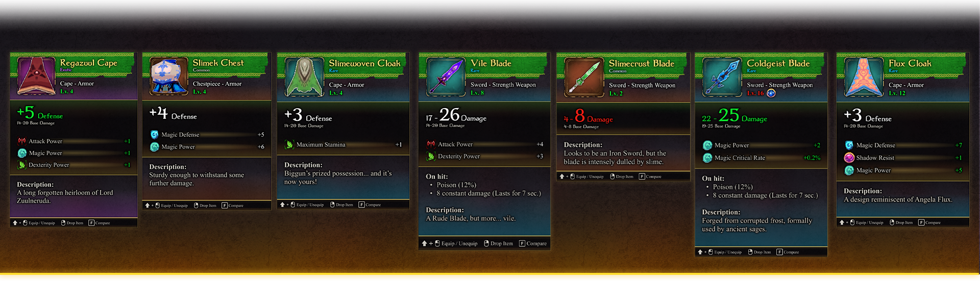 Attribute cards that appear when the player hovers the mouse over an item in their inventory.