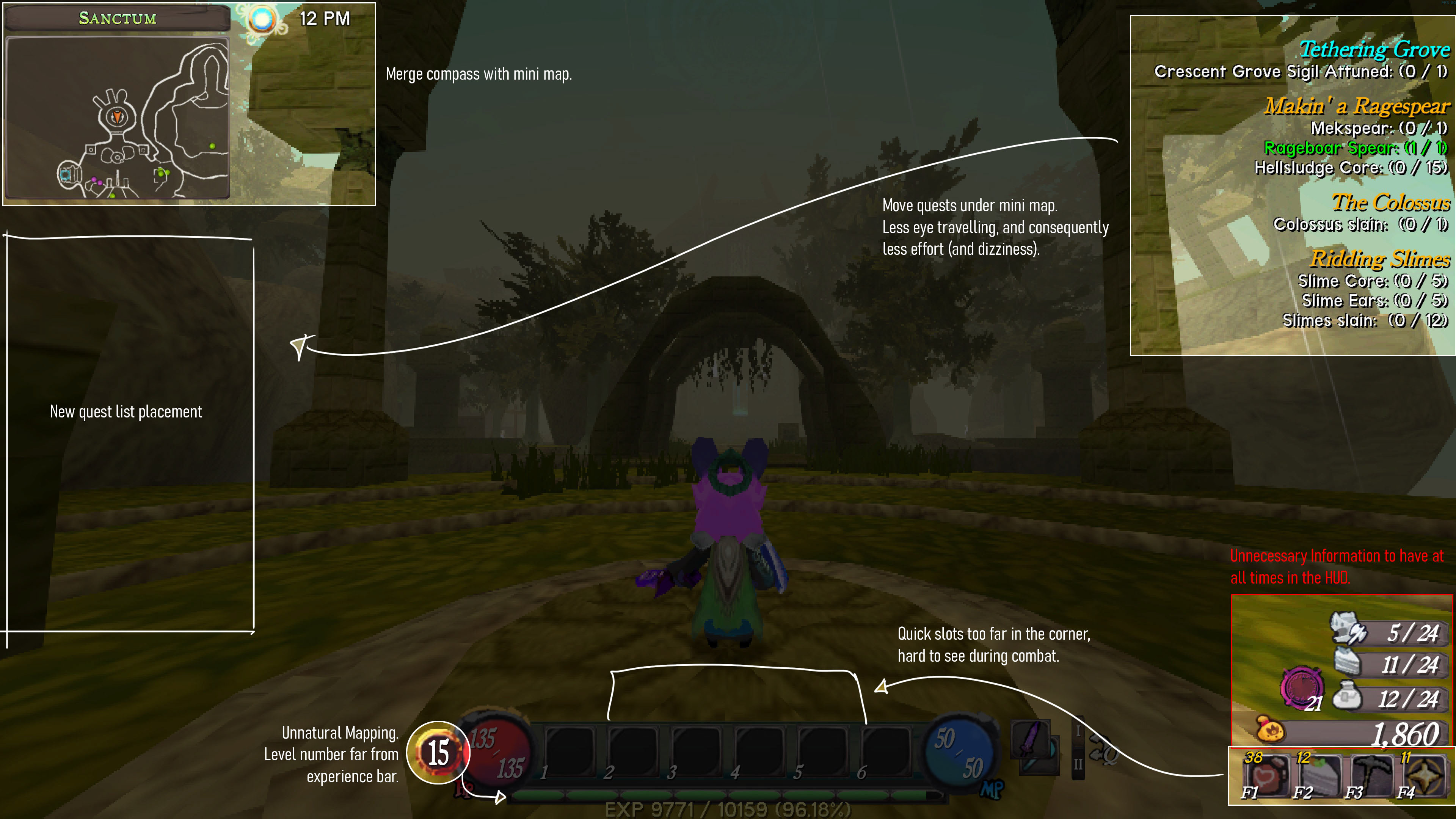 - Unnecessary information cluttering the screen (we don't need to see how many items we have in our inventory at all times).