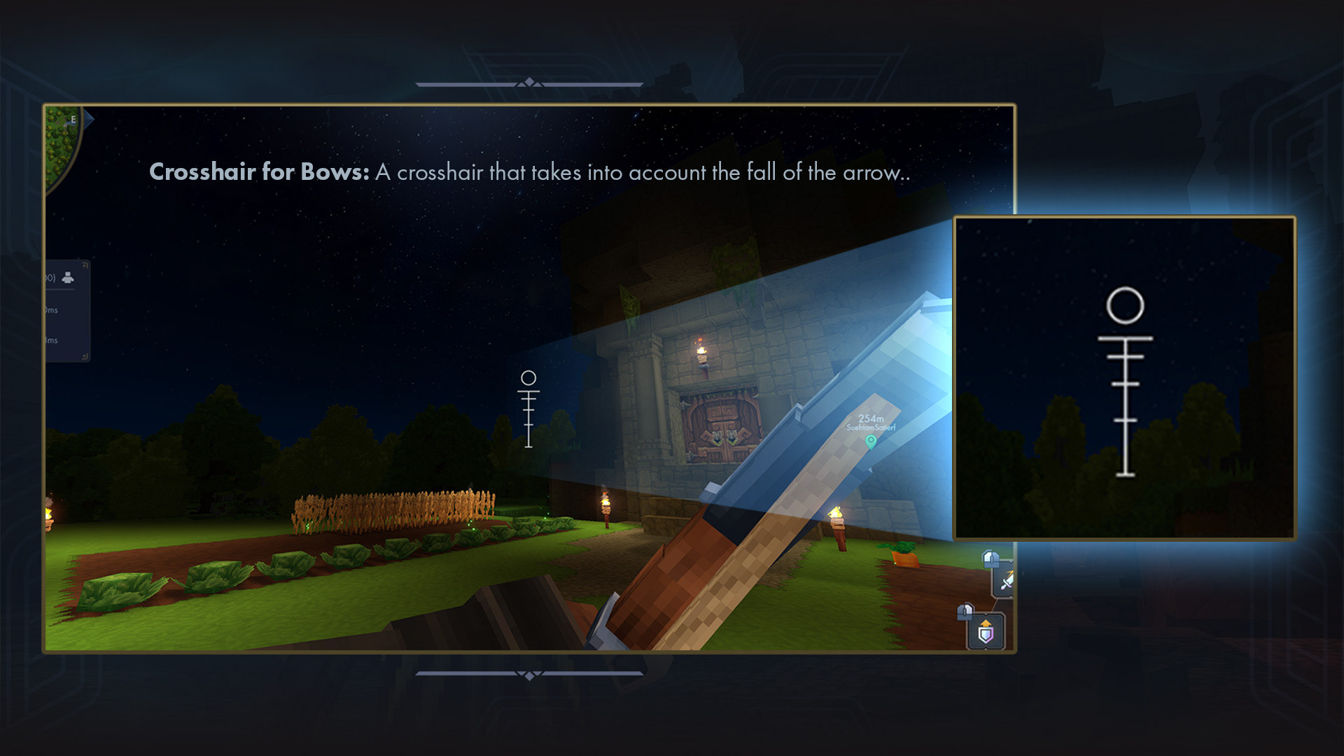 Different Crosshair for Bows: It can be fun to learn the arc at which an arrow loses altitude with distance, but for some players, it'd also be great to give them a crosshair that gives them that information straight up. Very commonly used in FPS games, I think it'd be a welcome addition to Hytale.