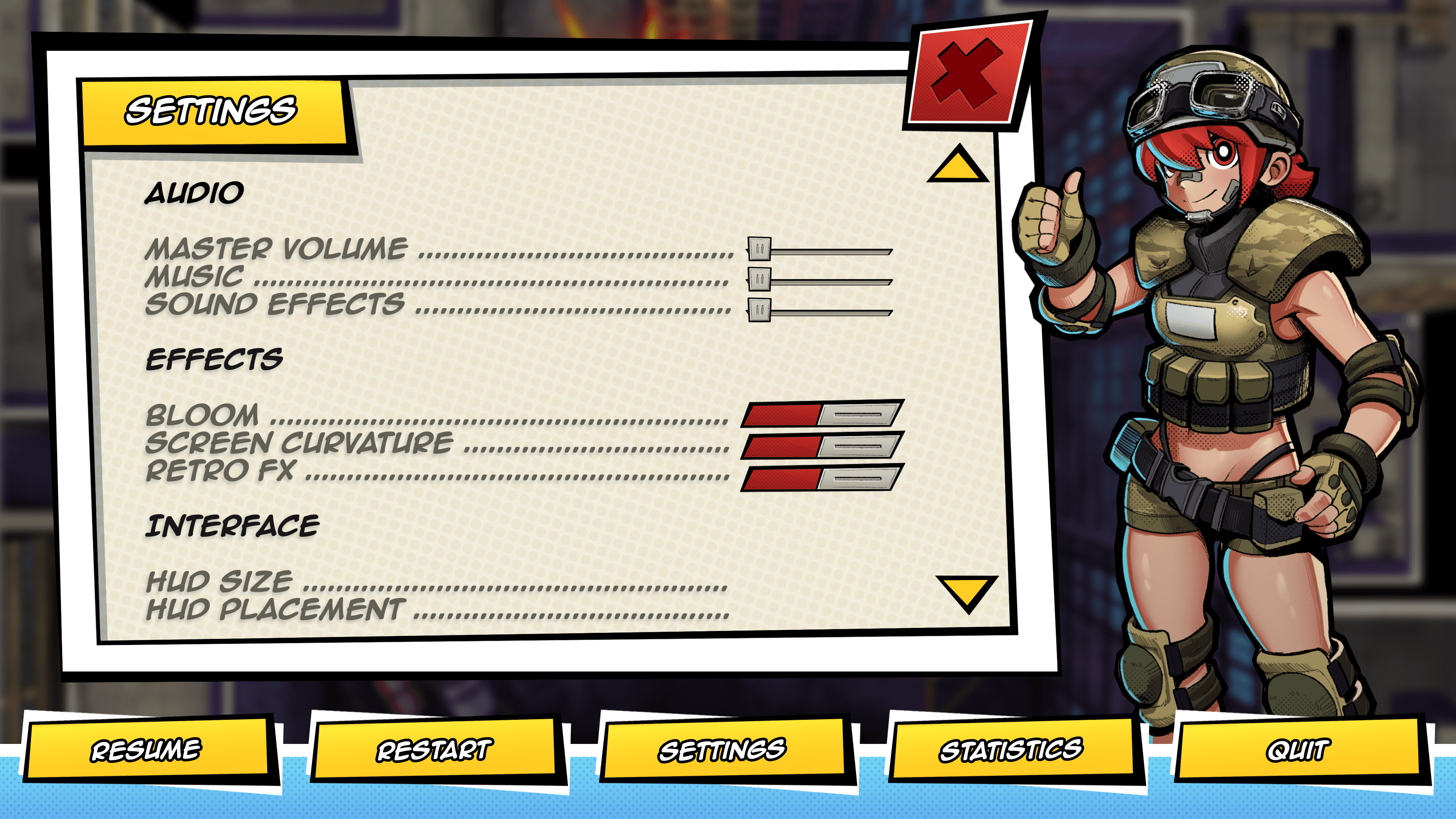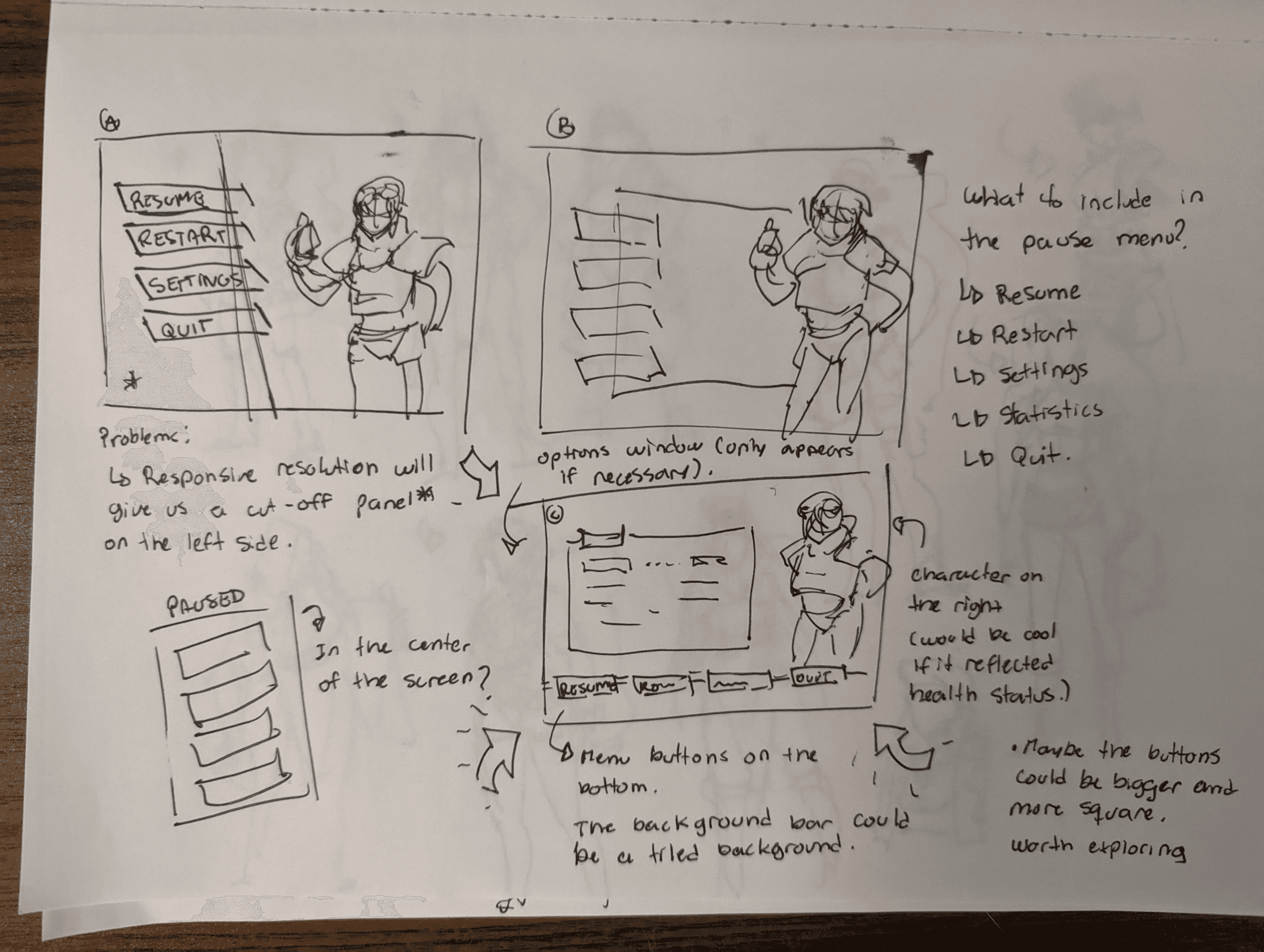 The use of character art in the interface extends to the pause menu as well. It is designed to have a render of the character the player is playing as displayed on the right side. Ideally, the character illustration would be animated, but that's currently a wishlist item due to scope concerns.