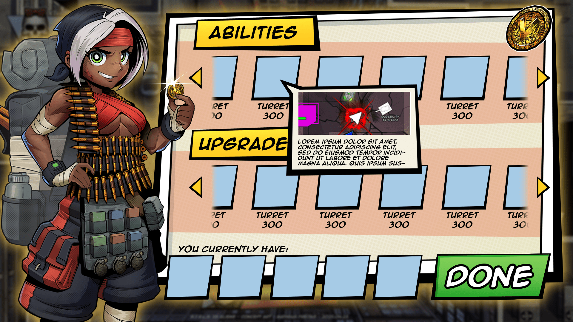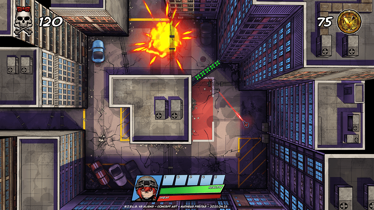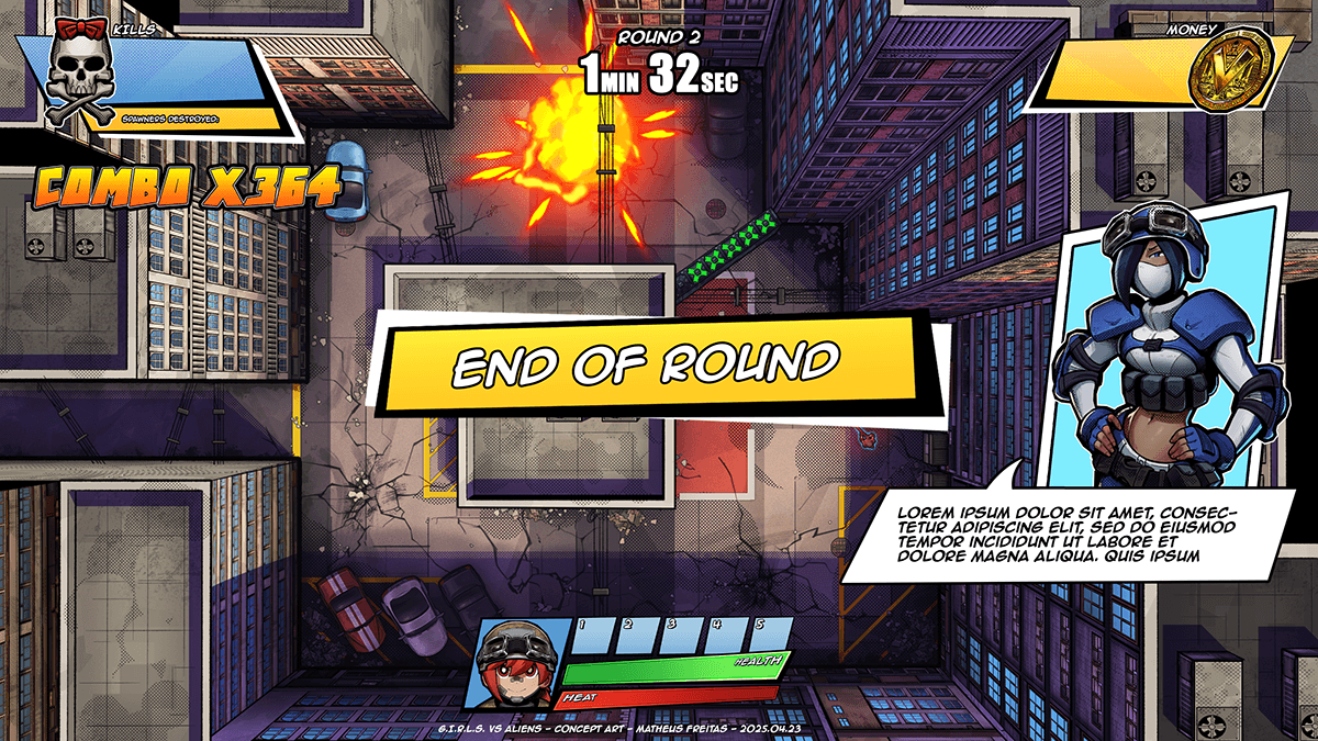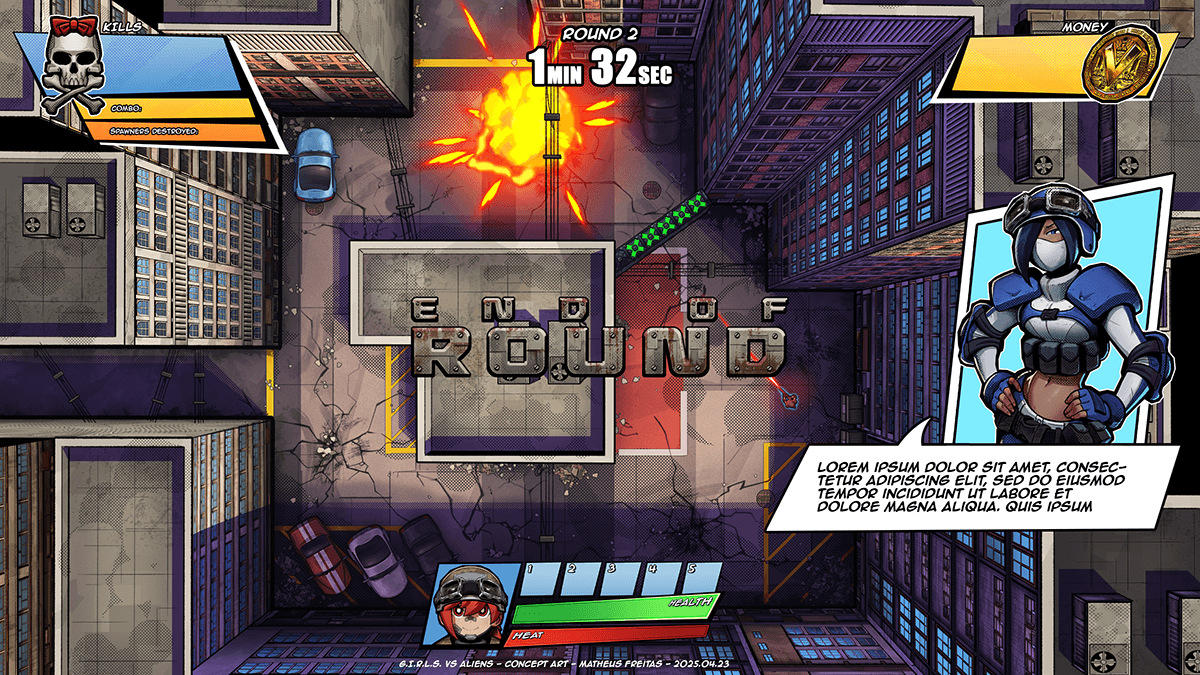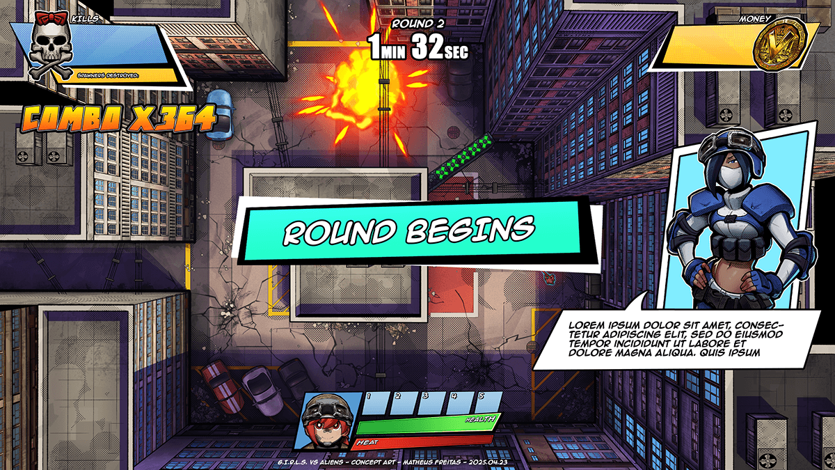 Although most UI assets from Project TANK have been scrapped, some elements survived. A coin had already been designed to represent the Victory Token, so that was repurposed into a money icon for G.I.R.L.S. vs Aliens. The skull and crossbones icon was repurposed from a sticker design used on a gun.