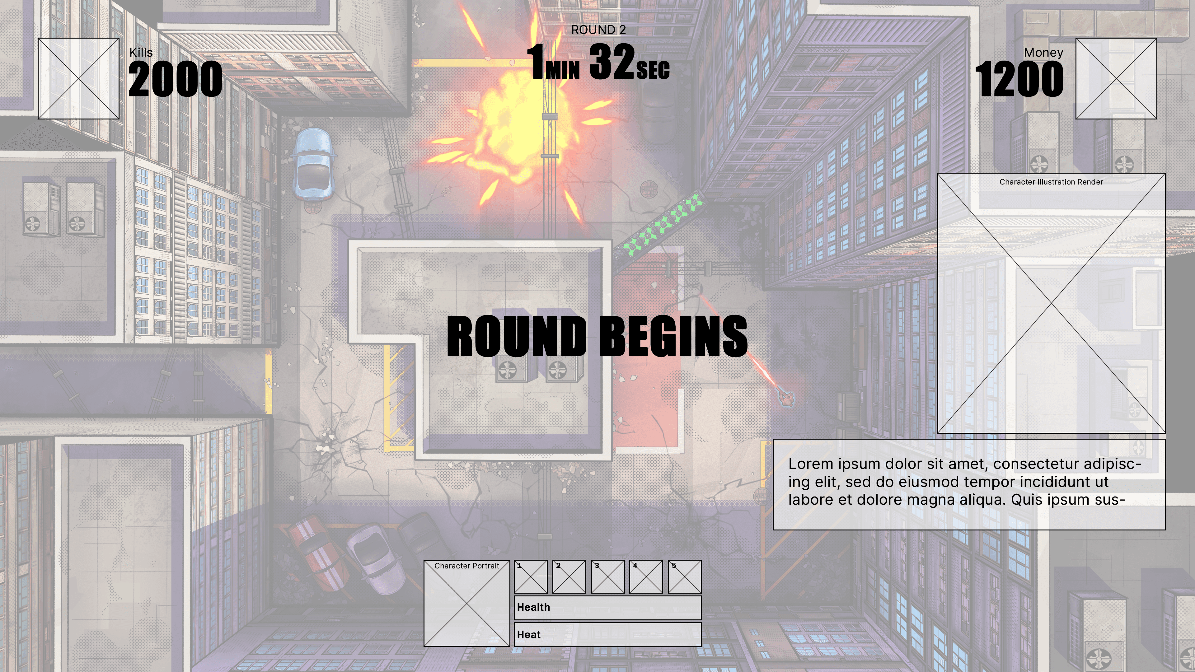 Hence, the new approach was to ditch the military theme and stick to the comic book art style the game already has. That created opportunities to design more impactful UI elements and use more vibrant colours while perfectly fitting the art direction.
